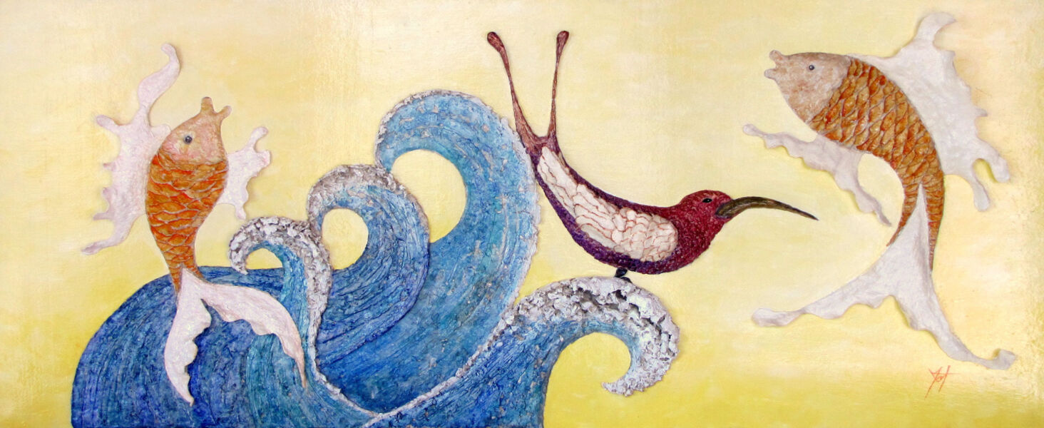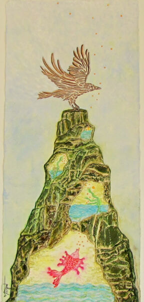 Le Grand Saut,20''x35'',Gravure en relief,papier fait à la main par l'artiste.