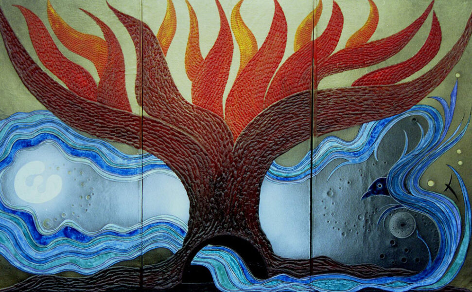 Arbre de Feu,18''x18'',papier fait à la main par l'artiste, relief,peinture acrylique.original en édition limité sur 50